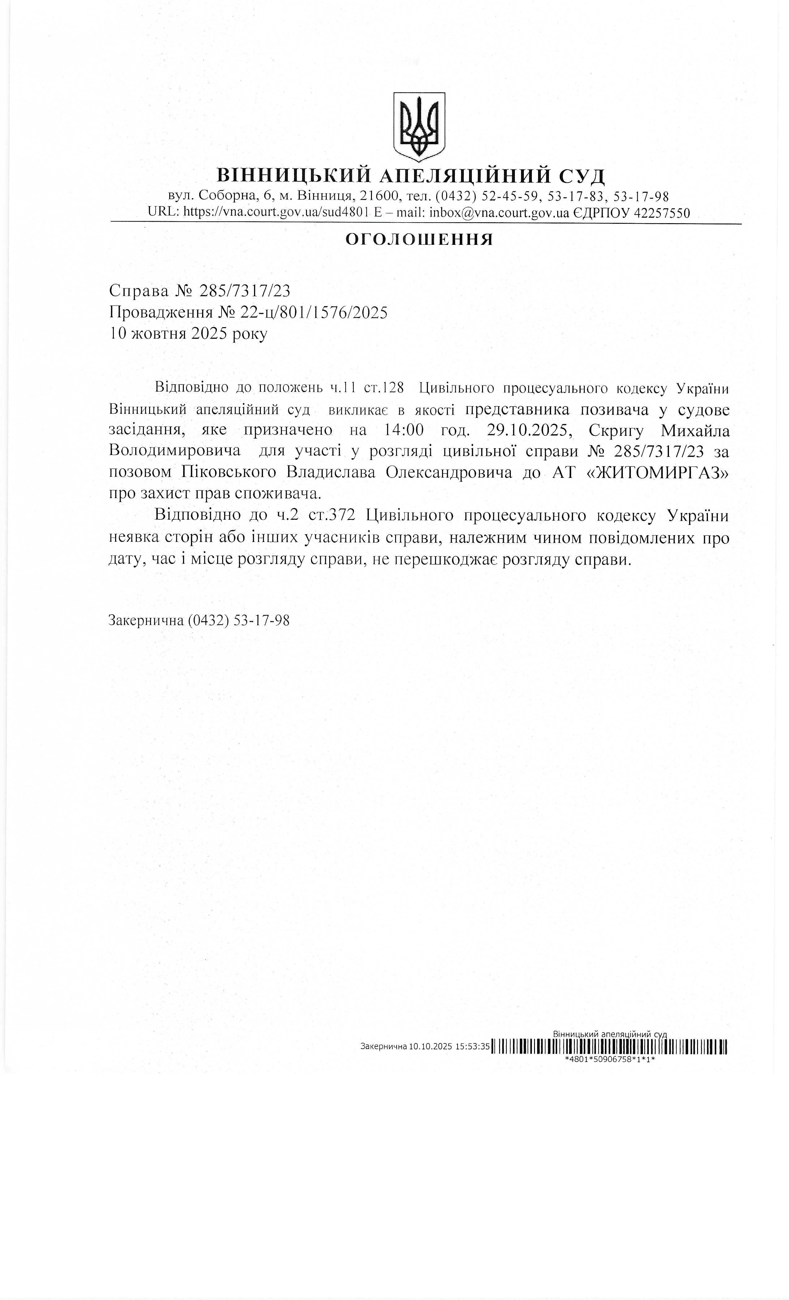 Повідомлення про виклик до суду Скригу Михайла Володимировича