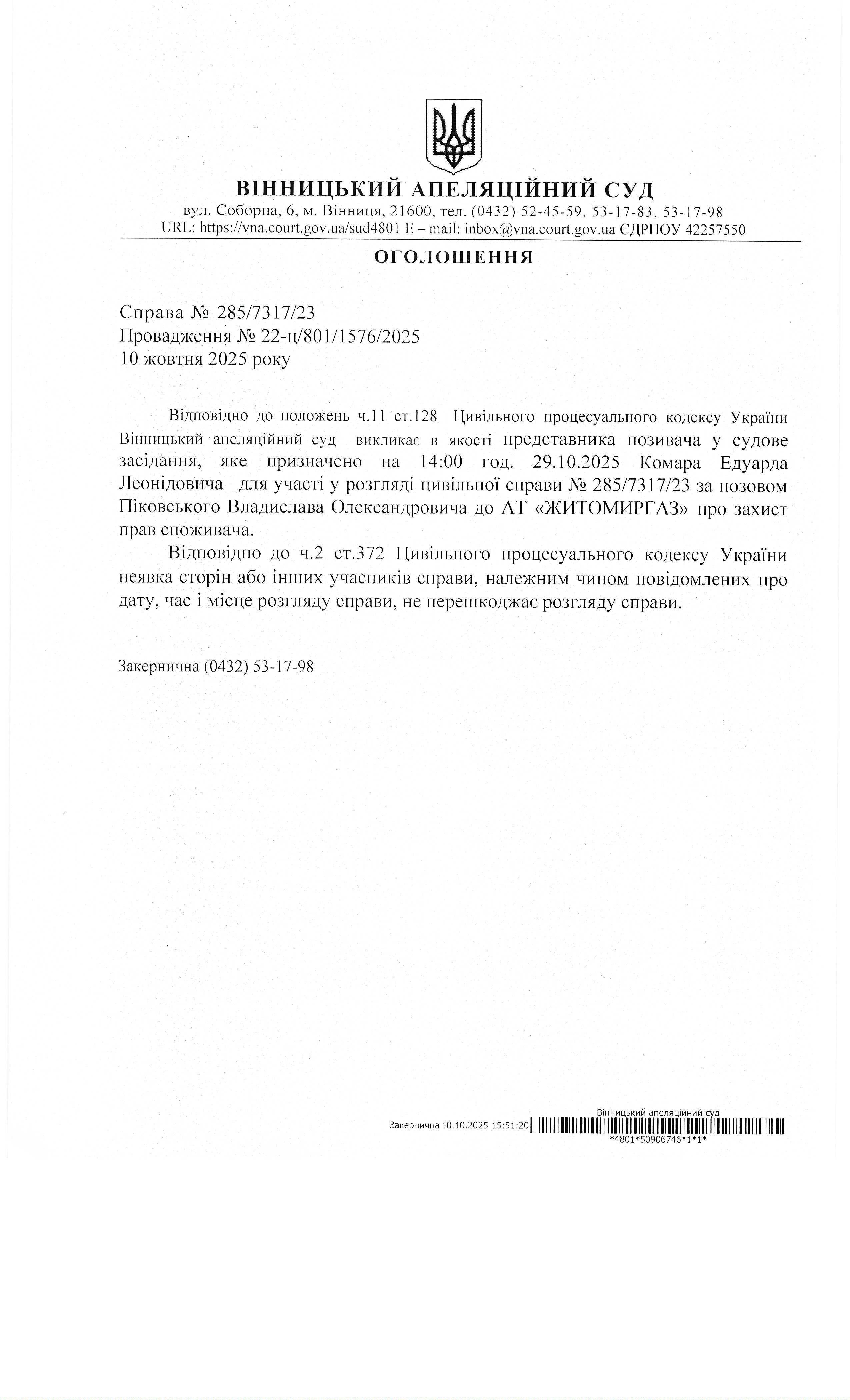 Повідомлення про виклик до суду Комара Едуарда Леонідовича