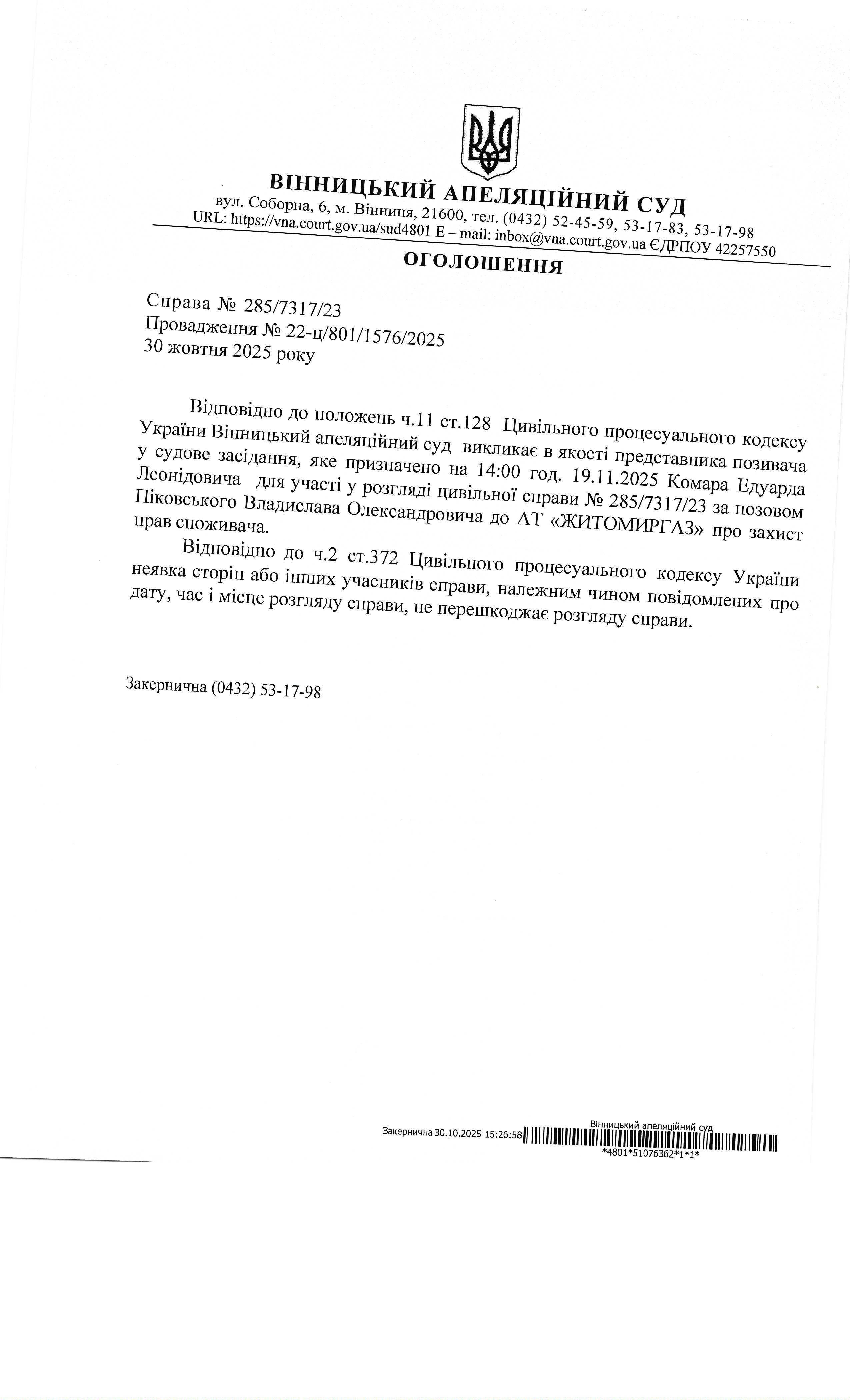 Повідомлення про виклик до суду Комара Едуарда Леонідовича