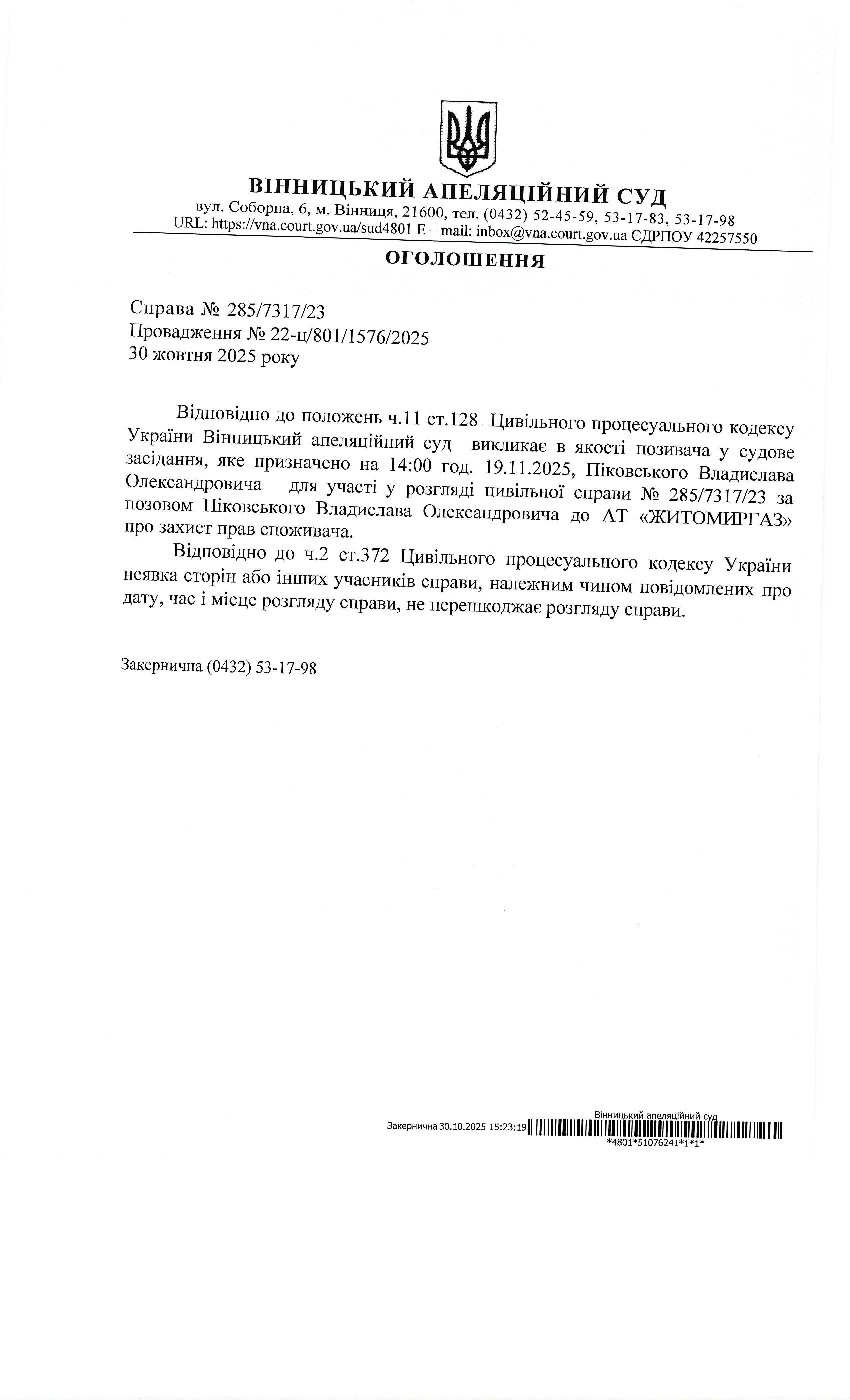 Повідомлення про виклик до суду Піковського Владислава Олександровича