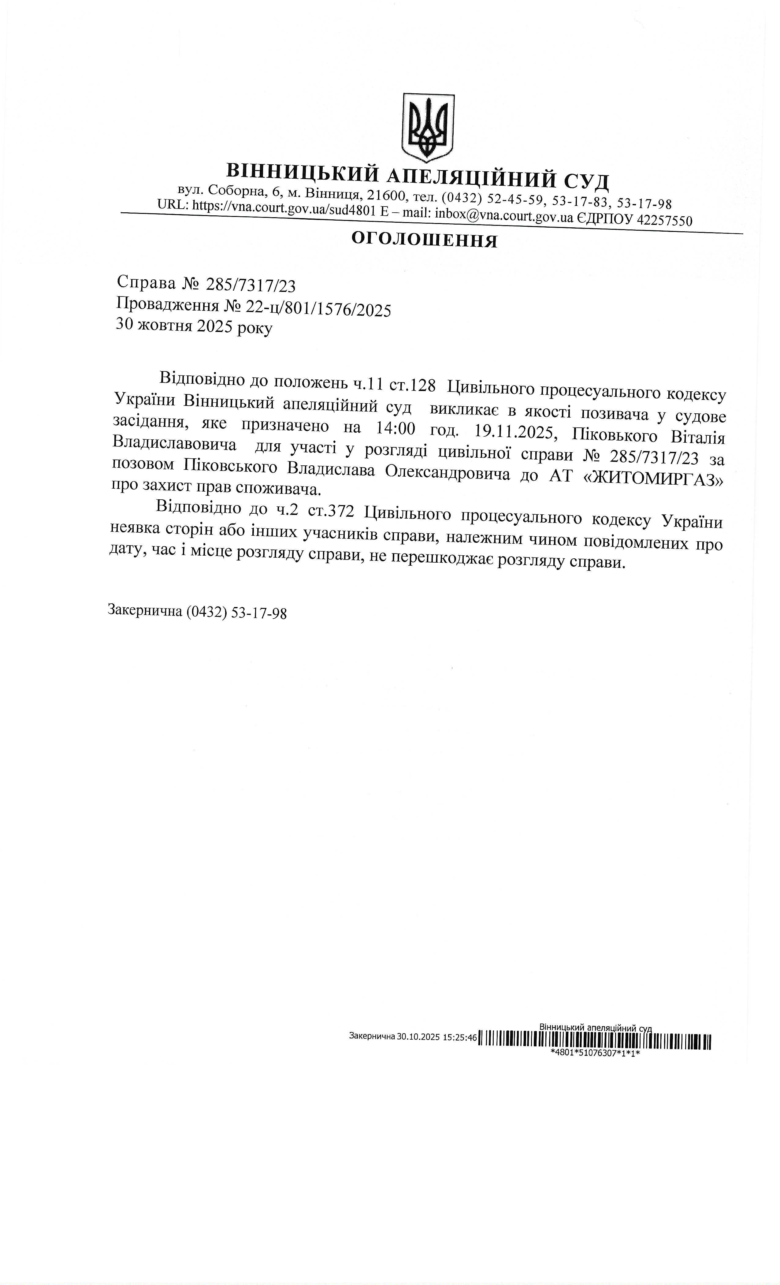 Повідомлення про виклик до суду Піковського Віталія Владиславовича