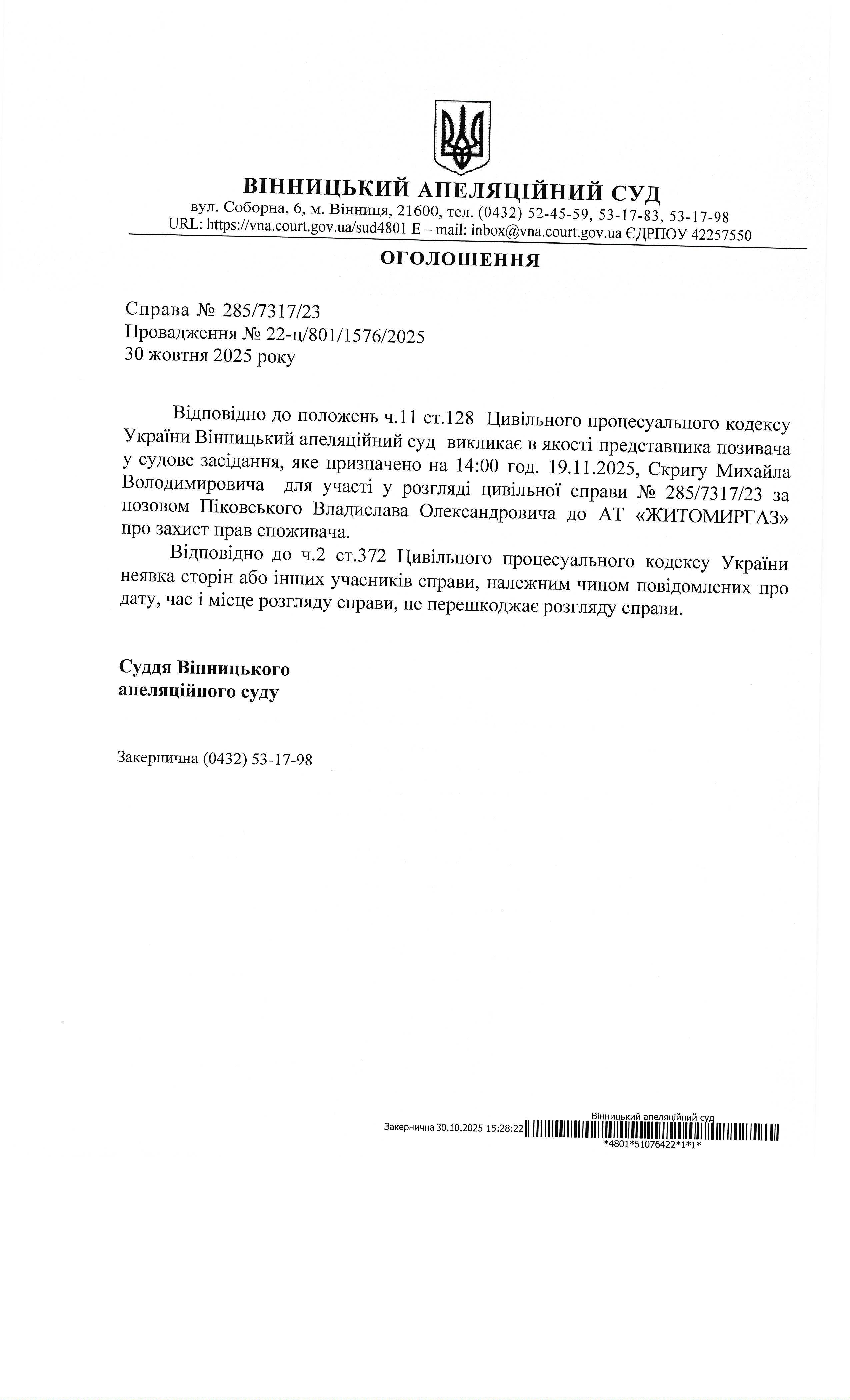 Повідомлення про виклик до суду Скригу Михайла Володимировича