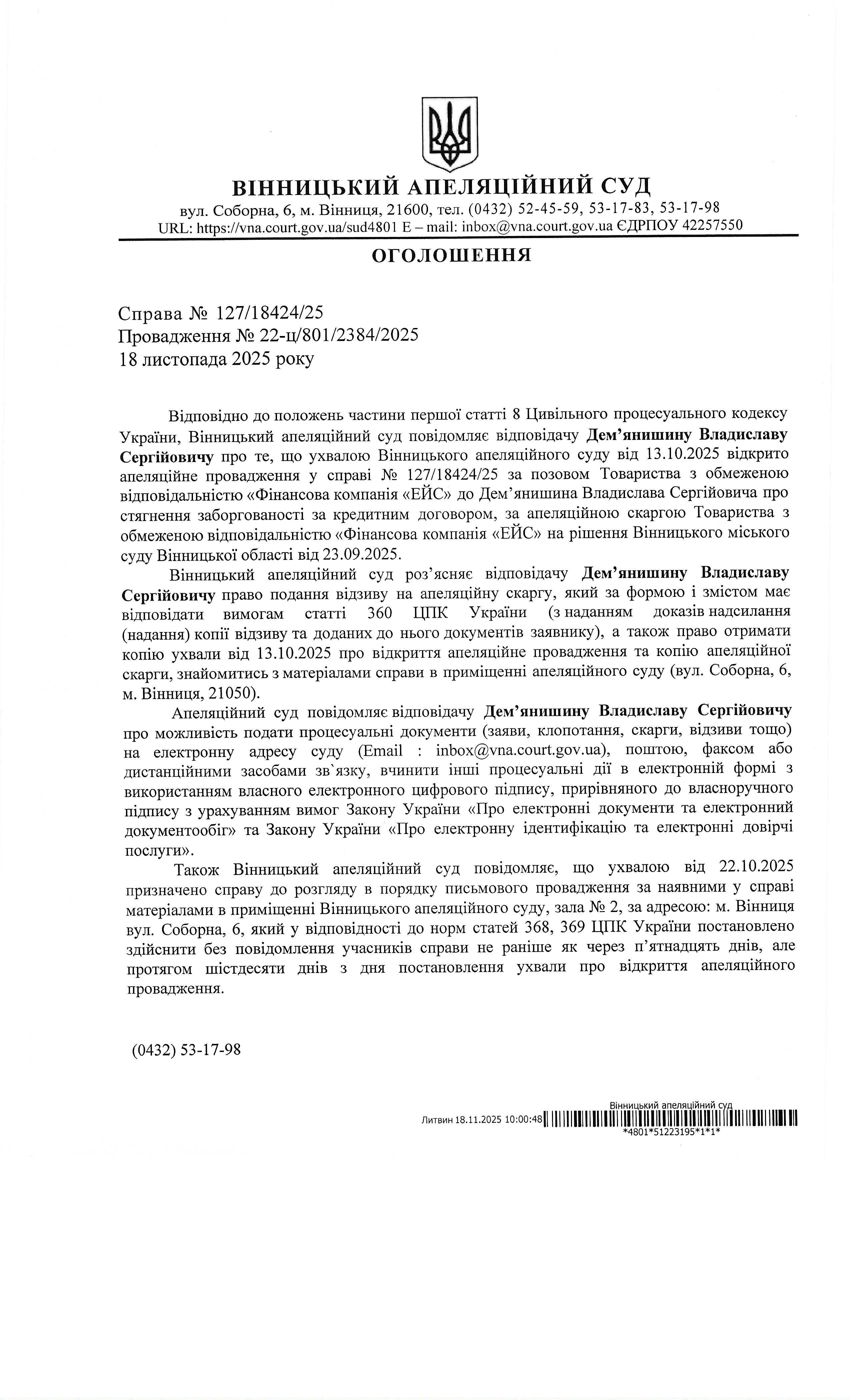 Повідомлення про виклик до суду Дем`янишину Владиславу Сегійовичу
