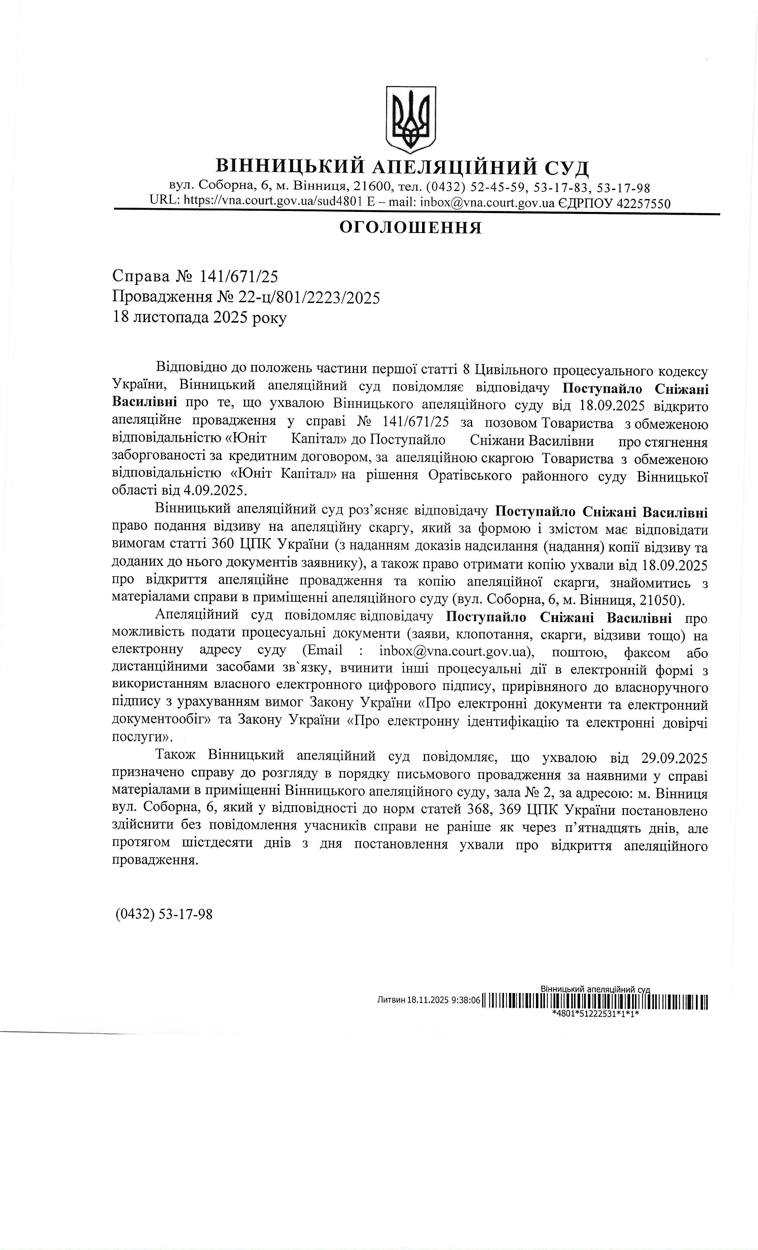 Повідомлення про виклик до суду Поступайло Сніжані Василівні