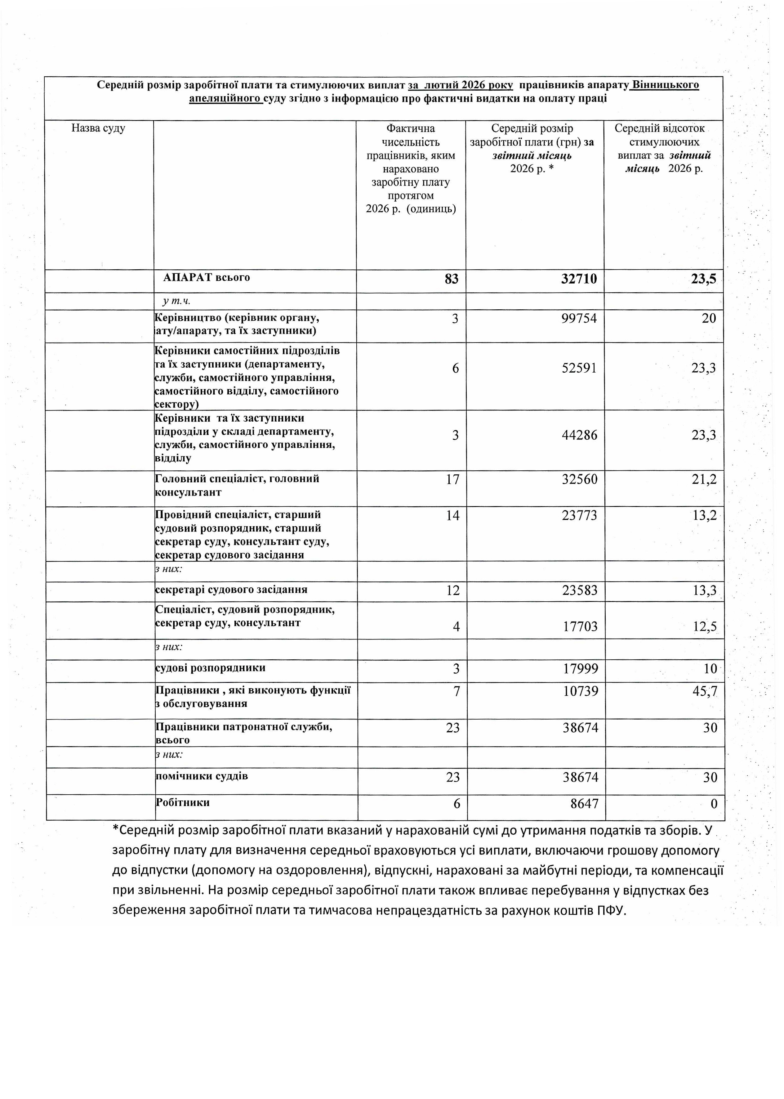 Середній розмір заробітної плати та стимулюючих виплат за лютий 2026